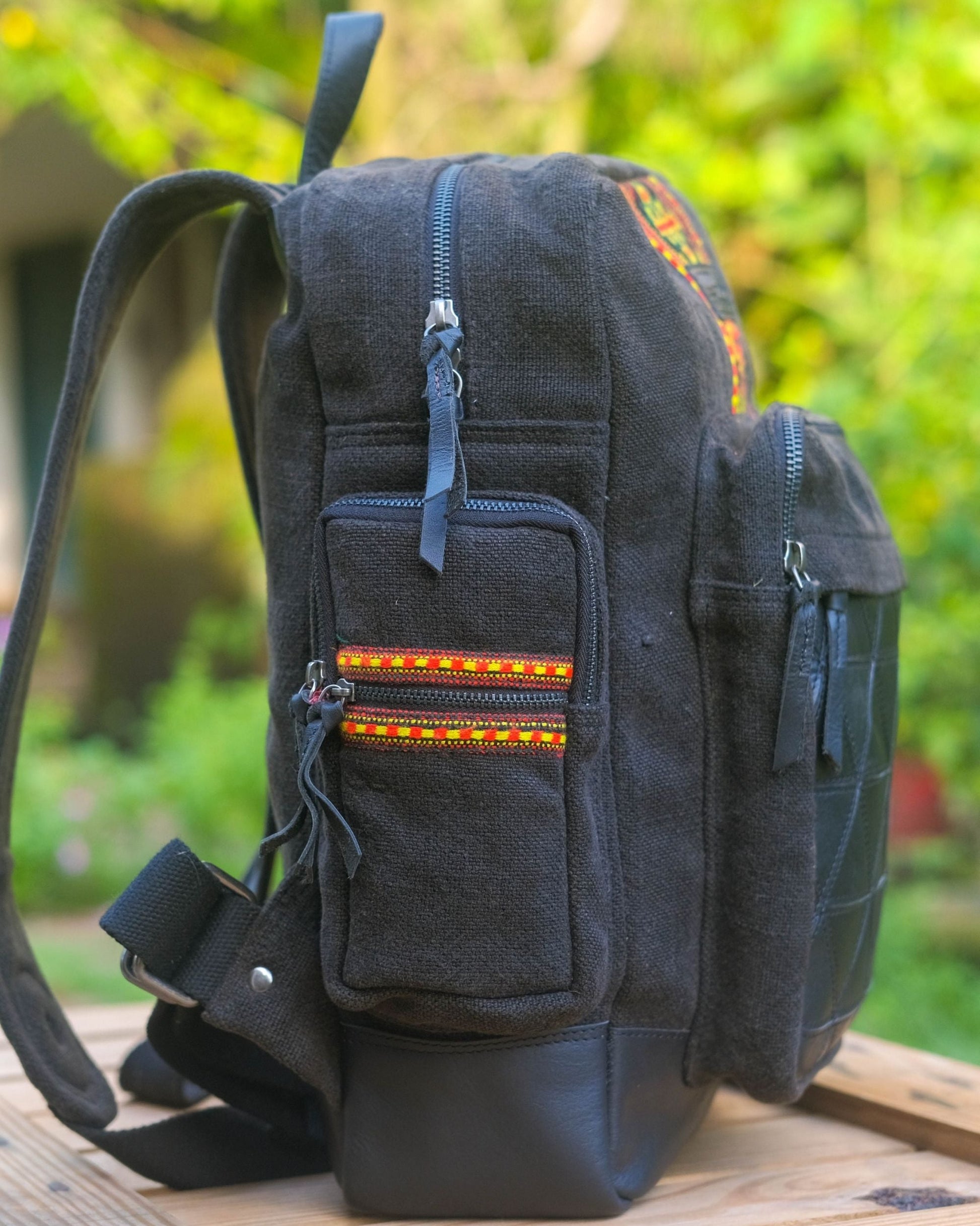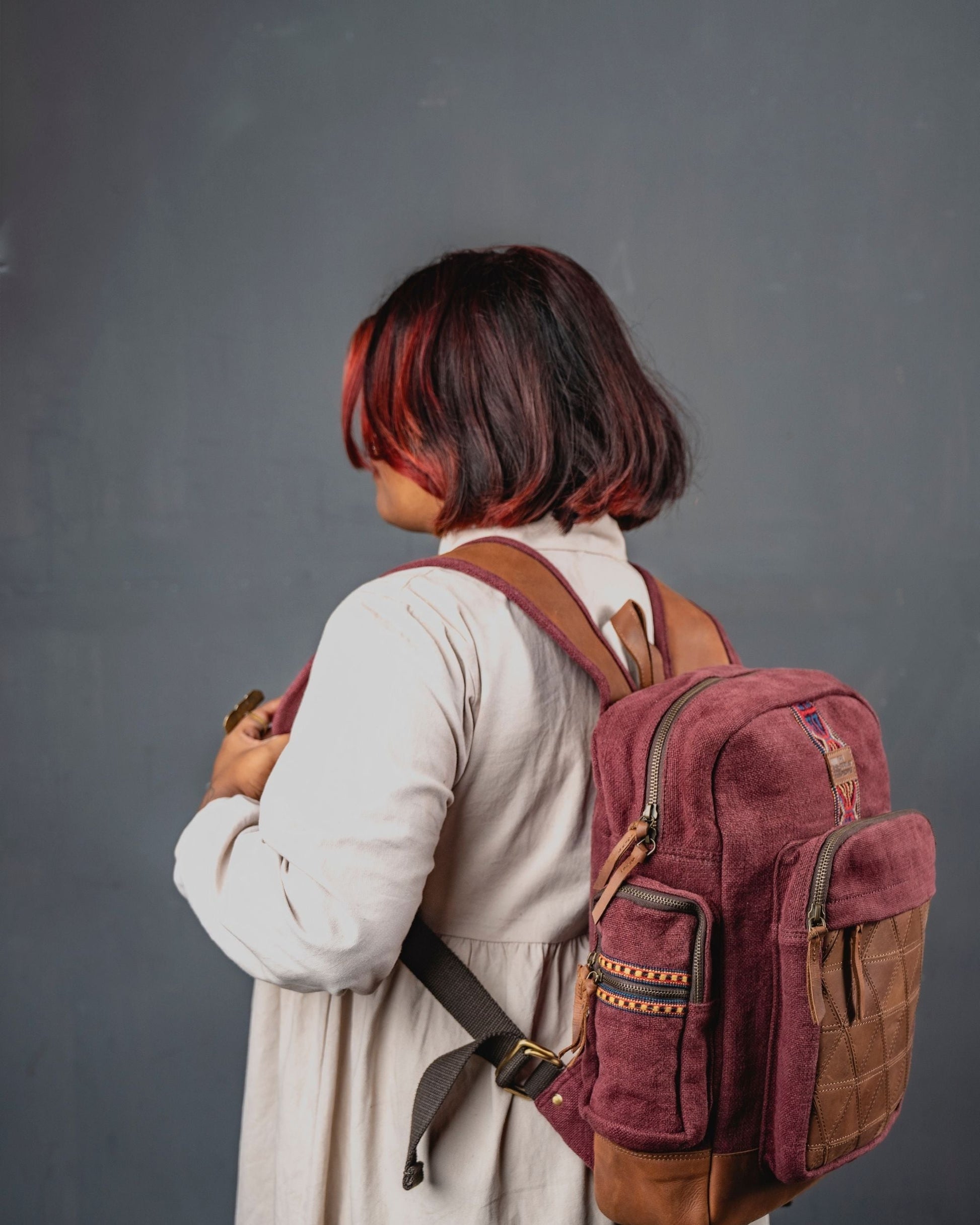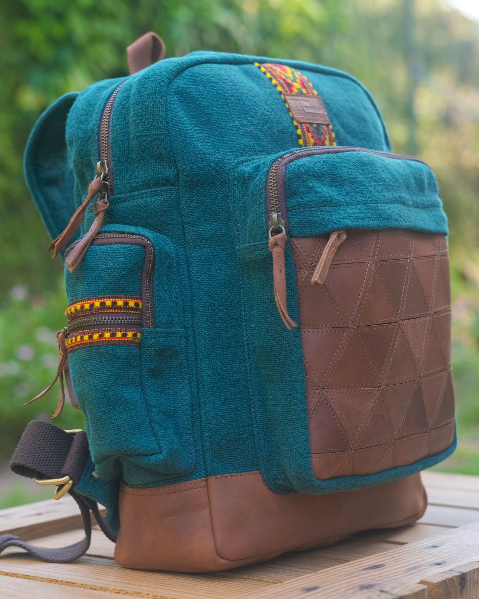 Handcrafted from upcycled leather and Parvati strips, this backpack is a story stitched together — no two alike. Built strong to carry, designed with care to stand apart. Spacious, functional, and full of character, it turns scraps into something lasting.