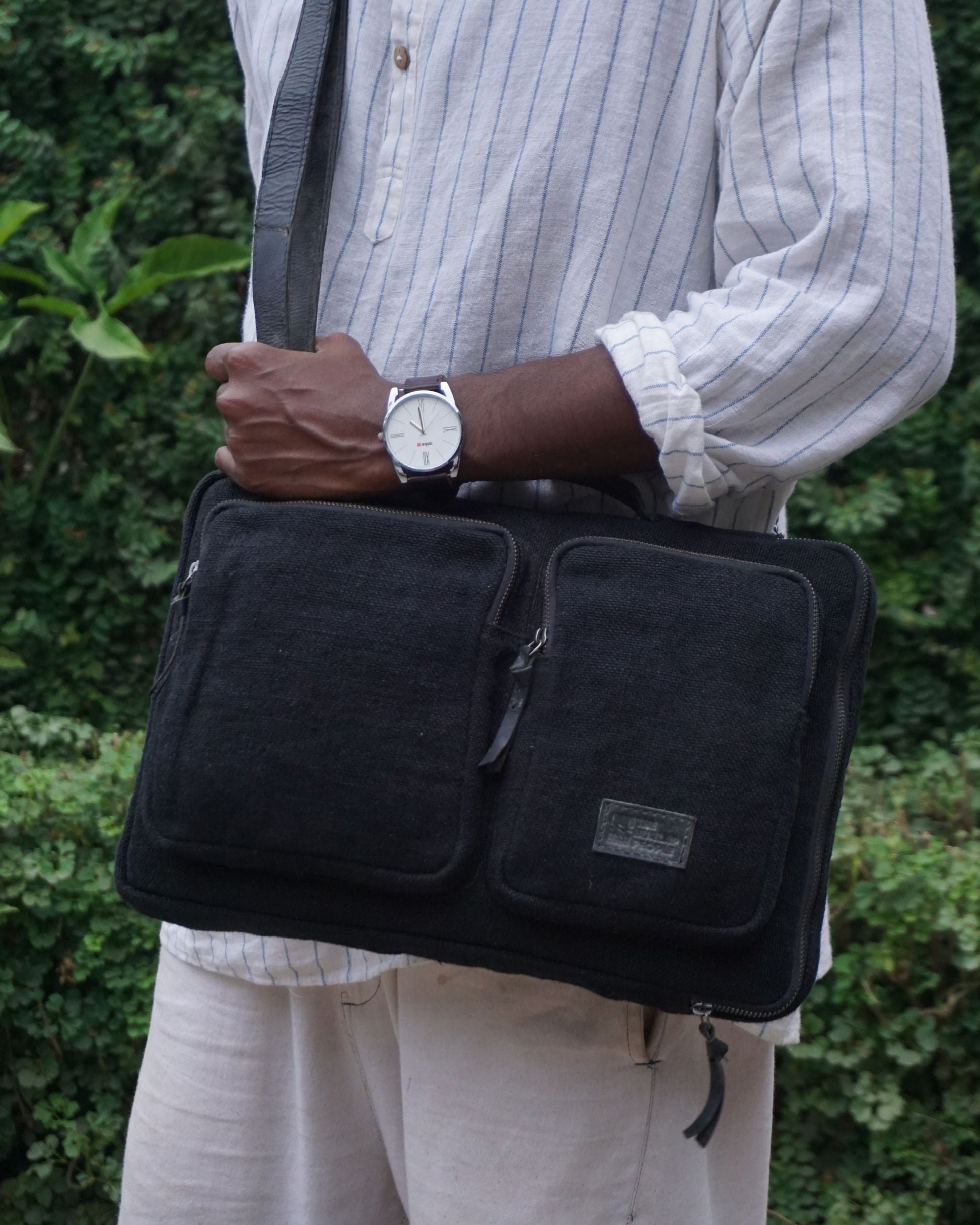 Built with roomy pockets and thoughtful compartments, this bag keeps your laptop and essentials in order — no clutter, no scramble. Comes with a removable sling for when you want to go hands-free, and strong handles when you don’t. Natural fabrics, sturdy make, timeless look.