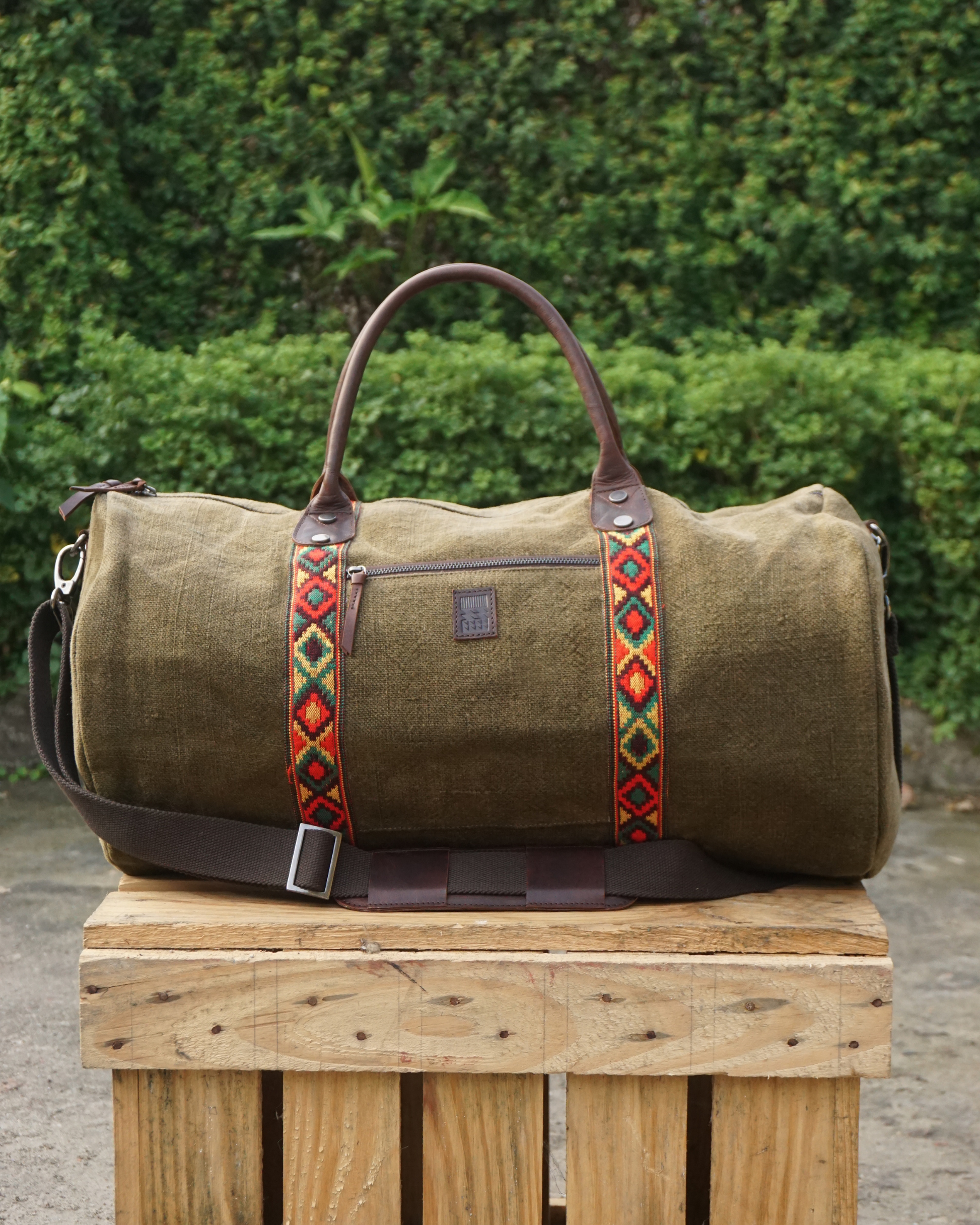 Our spacious Parvati Duffel comes with fabric weaved by Himachali craftspeople. Toss in all your things and take that spontaneous trip you planned forever ago. Designed keeping travel in mind. The ones you can take everywhere, the ones that weather it all. Our Duffels and Weekenders are faithful companions to any a journey, the kind of bag that fits in to any scenario from a monastery on a mountain top to a wedding on the beach.